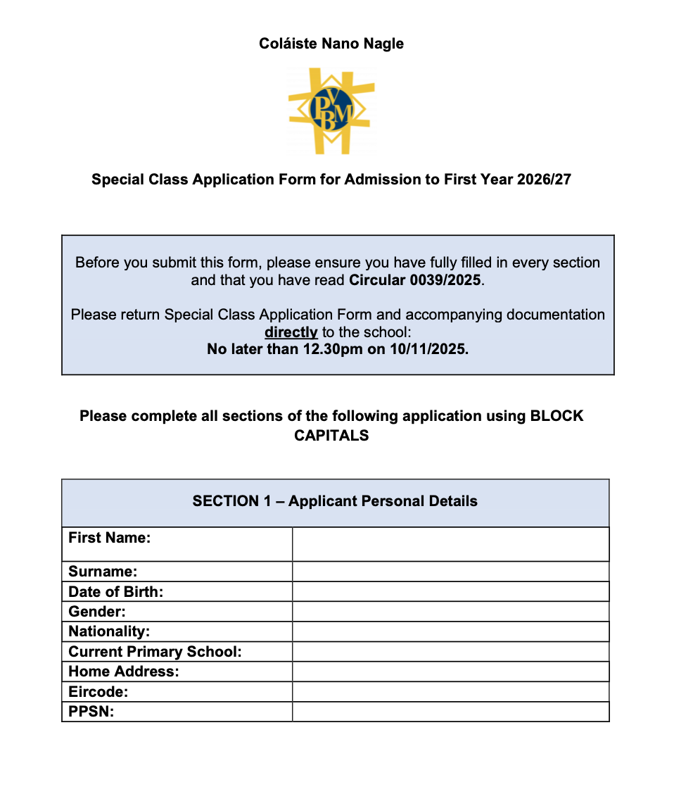 Special Class Application Form 2026/27